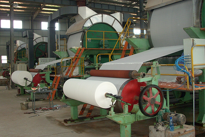 3. 抄造过程:纸浆经方锥管多管布浆器进入翻浆区翻浆进入网部,采用风压成型的方法在圆网笼部位成型,经伏辊吸咐在毛毯上,再经吸水箱预脱水后随毛毯带入托辊与烘缸之间,紧贴缸面烘干、起皱,最后经卷纸机进行卷取。